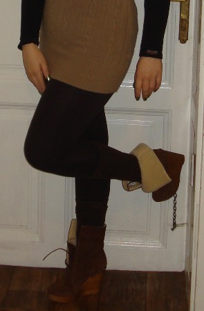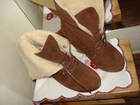 Dar cizmuliţele pe care le vedeţi mi-au plăcut aşa de mult, încât m-am încumetat să dau 249 lei pe ele. Să vă zic: piele întoarsă, îmblănite (mai puţin în zona degetelor, să îţi vină calapodul), platformă super la modă de lemn şşiiiii… talpă antiderapantă, în caz că ai nenorocul să mergi prin zone “îngheţate” cu ele. O mică protecţie să nu-ţi frângi gâtul. Şi-s comode.