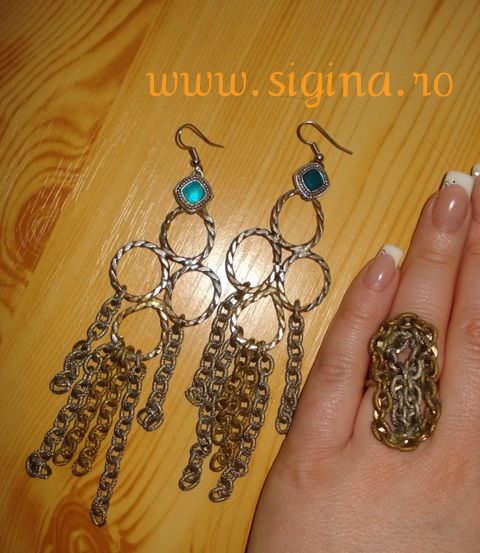 Aceştia sunt nişte cercei luuuungi şi destul de grei, de aceea îi port mai rărişor. Inelul e un fel de ghemotoc din acelaşi lanţ din care sunt făcuţi cerceii. Ador pătuţa turcoise de culoare de la cercei.
