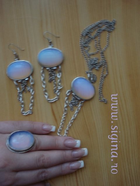 Astea au o poveste interesantă. Sunt pietre de opal. Eu aveam un inel de argint cu piatră de opal, cel de pe deget. Îl ador, îl am de ani de zile. Într-o zi am intrat într-un chinezesc să mă uit, că meseria cere. Şi ce văd, brăţări cu câte cinci pietre, printre care şi una cu opal, de forma şi grosime identică aproape cu cea a inelului meu. Am rămas mască. Bine, montura era de plastic, dar brăţara era ieftină, vreo 10, 12 lei, aşa că am cumpărat-o rapid, să îmi fac set pentru inel. Şi Diana did it :P. Mi-a făcut cercei şi pantantiv.