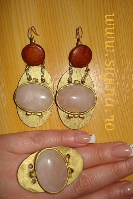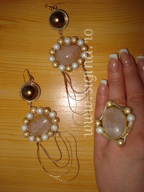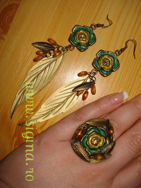 Acest set e realizat dintr-un pandantiv dezmembrat, era foarte încărcat, drag mie, dar pe care nu îl prea purtam. Din el a rezultat ce vedeţi, inel şi cercei, plus inelul şi lănţicurile de la cerceii din setul anterior… Adică vreo două seturi.. ;))