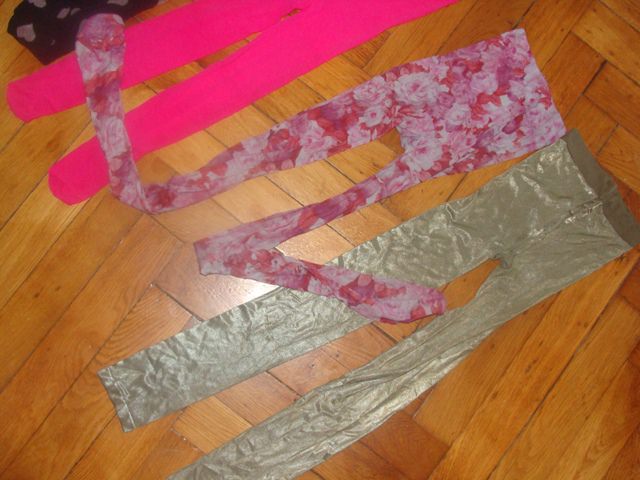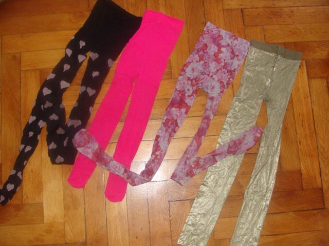 Sunt foarte drăguţi, dintre ei am încercat doar o dată ciorapii cu inimioare, în rest sunt noi. Primii sunt nişte colanţi lycra de un verde spre argintiu, următorii sunt cu imprimeu floral în nişte culori super purtate toamna aceasta, rozul ţiclam la fel iar cei cu inimioare iar, negru cu roz sters.