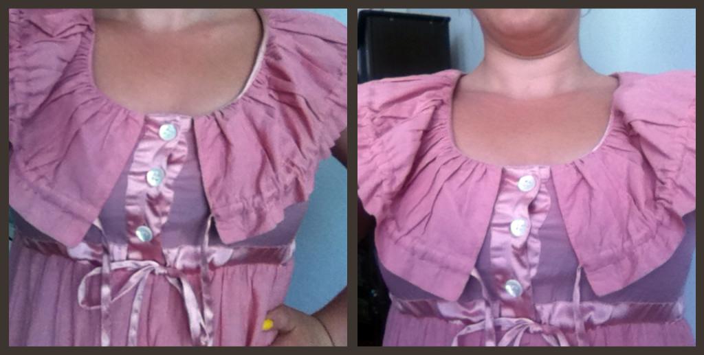 Culoarea e drăguţă, croiul la fel, dar guleraşul e piesa de rezistenţă, nici nu îţi mai trebuie gablonţuri. Singurul lucru care îmi displace e că la bust, croiul e cam strâns, chiar dacă e mărimea potrivită pentru mine. Ca să fie cât de cât ok la bust, am încercat un număr mai mare însă se aşează urât aşa că….
