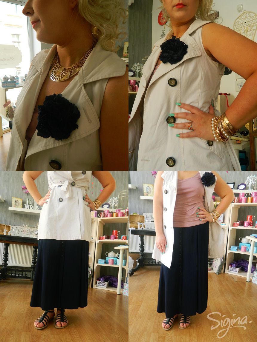 Cercelușii nu-s ai mei, sunt de la Happy Decor Boutique, dacă vă plac, sunt 25 lei. Outfit: fustă lungă no name (la vânzare la mine, încă n-am pus-o în shop dar va fi cam 25 lei), sandale romane, trench coat fără mâneci Atmosphere, brățări no name, colier H&M, maiou Takko Fashion; broșă/agrafă-floare Meli Melo