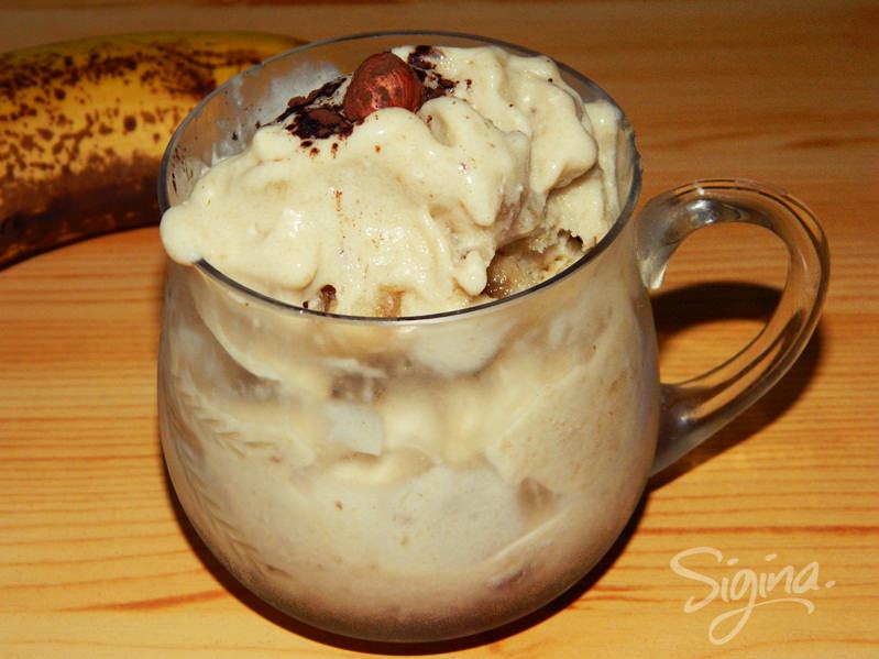 Cum faceți înghețața de banane pe care v-o etalez eu pe aici (n-o fi prea aspectuoasă, dar e foarte bună la gust): o banana feliata subtire, dată la congelator până îngheață feliile (vedeți să nu se lipească între ele, că vă dau bătăi de cap apoi). Scoateți feliile înghețate (nuj cât durează să se congeleze, că eu pe ale mele le-am uitat o jumate de zi la criogenat) și le puneți într-un recipient împreună cu o lingură mare de smântână grasă, apoi dați drumul la blender. Obțineți o pastă cremoasă, vâscoasă – înghețata. Gata. La acest fel nu e nevoie să adăugați miere sau alt îndulcitor, că e suficientă banana. Ușor, nu-i așa? Pe mine m-a inspirat kzarinne.