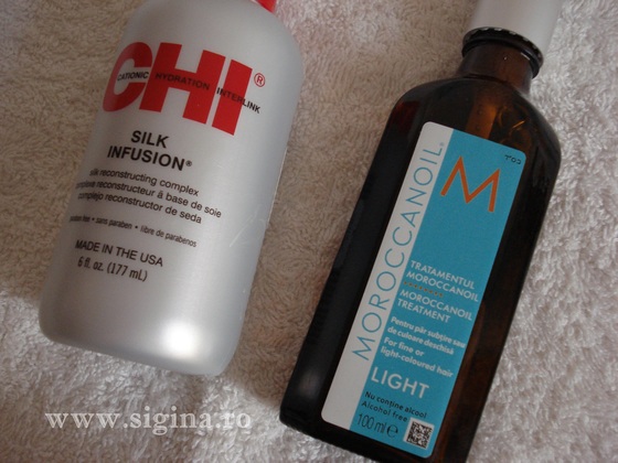 Ultima revelație a fost cea de la CHI, despre care rămăsesem foarte plăcut impresionată, în urma utilizării unei mostre, uitate de vreme pe etajeră, în baie. Prima comparație care mi-a venit în minte a fost cea cu Moroccanoil, varianta light, pe care îl iubesc de la primul contact. Când i-am zis lui Raul despre Silk Infusion, mi-a și tăiat craca: până să ajungă CHI pe Moroccan, mai are mult. M-am supărat puțin. Adevărul e că, deși Silk Infusion are cu totul altă tehnologie decât Moroccanoil, la capitolul versatilitate nu stă atât de bine.